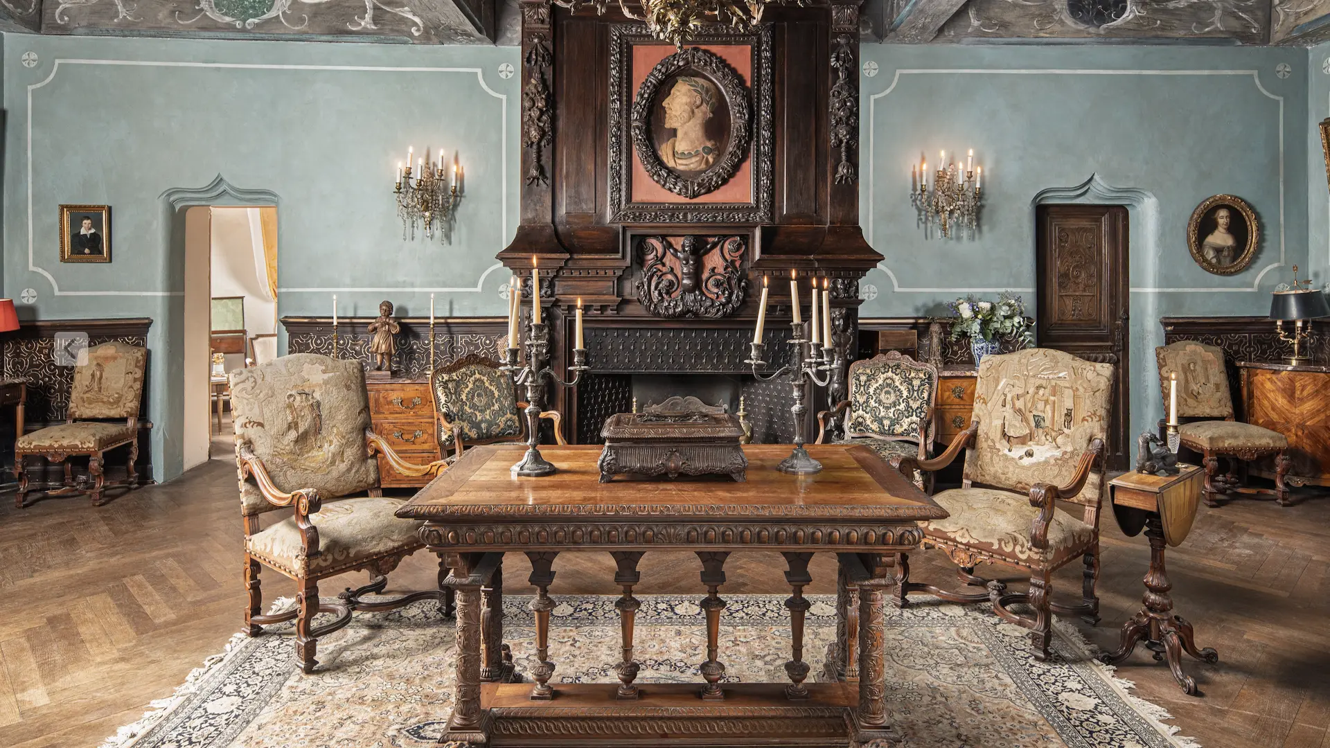 During the 15th century, the inside of the castle was rearranged, especially the Louis XIV chimneys are installed on the noble floor and inside small appartements. In the large living room on the first floor, there is a magnificent chimney carved in the Mannerist Style.
